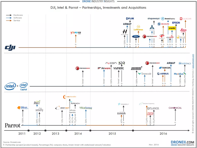 英特尔、parrot和大疆在无人机领域的投资、收购和合作情况/图 来源:DRONEII 英特尔、parrot、大疆创新,无人机领域最典型的三家企业,为了能站在无人机浪潮的浪尖上,可谓各显其能。下面就详细介绍下,这三家民用无人机领域巨头公司最近几年间的投资、收购和合作企业情况,以一窥它们的战略布局。 PC时代后,英特尔的转型 在PC市场增速放缓后,英特尔开始加大了在其他领域的战略布局。从过去几年的种种表现来看,英特尔在无人机领域野心十足。 2014年,英特尔投资美国无人机企业PrecisionHawk。PrecisionHawk公司是一家无人机数据解决方案提供商,面向农业、能源业、建筑业等专业领域客户提供无人机数据服务,在农业领域,帮助生成精准农业NDVI指数图,从而了解植被生长状态、植被覆盖程度等信息。公司累计融资达到2900万美元。PrecisionHawk的数据服务方案叫做“DataMapper”,可满足数据处理、管理、共享和分析等要求,支持导入任何不同无人机采集的影像数据或者卫星影像数据,生成2D地图、3D模型、点云数据和DSM,数据可以分享至云端或者移动设备,用户按需选择分析工具,从而获取想要的数据结果。 2015年5月,英特尔投资美国公司Airware。Airware主要做操作系统,它的理想是做无人机领域的微软,为无人机打造通用平台。2015年早些时候,Airware发布了一套专业无人机操作系统Aerial Information Platform (AIP)。这是一个围绕着硬件和软件两部分开发的使企业控制无人机标准化的平台产品。据公司创始人Jonathan Downey 公布的信息,任何运行Airware系统软件的无人机都将可以被设定、部署和用于指定任务——即使这些无人机均是出自不同厂商的不同型号,又或者是出厂时已被设定为某个特定领域的针对性产品。值得一提的是,迄今为止Airware已经累计融资超过1亿美元。 2015年8月,英特尔又豪掷6000万美元投资无人机制造企业昊翔(Yuneec)。2016年年初的CES上,英特尔CEO Brian Krzanich还展出了这家公司的产品。 2016年1月,英特尔完成了对德国无人机制造商Ascending Technologies的收购,早前双方曾在无人机避障技术上有一些合作。英特尔在2016年10月推出的Falcon 8+无人机就是Ascending Technologies公司Falcon 8无人机的升级版本。 2016年9月,英特尔宣布收购计算机视觉处理芯片公司Movidius。该公司曾在《麻省理工科技评论》2016年杂志评选的“全球50家最智能公司”中排名第30。据悉,谷歌Tango平板电脑和大疆的精灵4无人机都使用了Movidius的芯片。 2016年11月消息,英特尔又收购了德国无人机软件和硬件制造商MAVinci,面向工业级客户。MAVinci将会与Ascending Technologies配合,帮助英特尔在工业级无人机领域开疆扩土。 尽管无人机不是英特尔唯一看好的成长点,但从以上不难看出,相比于其他跨界企业,比如小米、腾讯或者其他为无人机提供芯片的厂商,英特尔显然更加用心。 Parrot——野心不只是硬件 Parrot在普遍比较年轻的无人机企业中来说算是个老牌厂商。创建于1994年的Parrot,起初并不是一家做无人机的公司,而是主攻无线、语音、蓝牙和车载环绕音响等产品。创任人Henri Seydoux也是在经历了多次转型之后,才与无人机结缘。成立伊始,公司主要做汽车免提技术,后来转向做了耳机。2010年AR.Drone四旋翼无人机亮相2010CES(国际消费类电子产品展览会),成为最夺目的产品之一,Parrot在无人机领域的知名度从此被打响。 投身无人机领域以来,Parrot发布了多款消费级无人机产品,还有一些趣味性十足的玩具类飞行器。所以一直以来,业内对Parrot的印象主要停留在消费级无人机上,Parrot被认为与大疆、3DR一路都是消费级无人机领域的领跑者。然而实际上,Parrot的野心不只是消费级,甚至不只是硬件。 2012年左右,无人机市场方兴未艾,Parrot就已经开始从多角度在无人机领域发力,几年间先后投资或收购了Pix4D、senseFly、AIRINOV和MicaSense等无人机硬件和软件公司。 2012年Parrot向Pix4D投资240万美元,拥有了后者56%股权。Pix4D是一家无人机数据软件公司,总部在瑞士,面向农业、建筑业、矿业、环境监测领域等,用于测土方量、使用多光谱传感器来生成精准农业NDVI指数图、生成等高线和管理监测自然资源环境的变化、为建筑,文化遗产, 考古等生成可测量文档等。其官方介绍称“Pix4D影像处理软件是您完整的测图&建模解决方案,转换数千张影像为对地定位的二维镶嵌图和三维模型。” Parrot 在 2012 年收购了 senseFly公司,后者开发测绘专用的无人机,现已经生产了eBee和eXom等测绘平台。 2014年和2016年parrot先后两次投资了MicaSense公司,累计940万美元。MicaSense也是一家数据解决方案供应商,既为无人机专用的多种光谱设备,也提供无人机遥感航测专用的数据处理软件。据MicaSense的CEO描述:“Parrot是MicaSense强有力的后援,它使MicaSense可以更为灵活地服务于整个商用无人机市场。” Parrot资金加持的还有Delair-Tech。这是一家法国无人机公司,同样是一家数据解决方案提供商,生产了三款工业级固定翼无人机,续航都在2小时以上,用户也可以直接购买服务,官方宣传语是“Tell me where you want to fly,we will do the rest”。 Parrot创始人Henri Seydoux曾说过:“无人机就像当年的诺基亚手机,很容易被模仿和超越,硬件产品的利润永远不会持续太长时间。”就是这样一个思想,让Parrot一直试图在越来越趋向同质化的市场中另辟蹊径。 大疆和它的友商们 最后再说一说,无人机