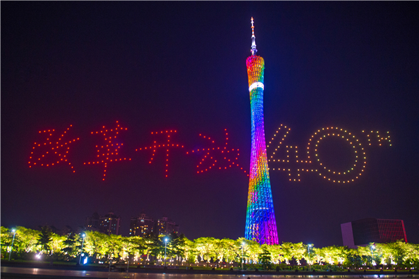 国庆节之夜,以“壮阔东方潮,我爱你中国”为主题的致敬改革开放40年国庆灯光表演主题活动在广州珠江两岸上演。10月1日晚,广州海心沙上空,300架无人机编队组成“改革开放40周年”字样祝福祖国,为市民游客献上一场视觉盛宴。来源:南方网