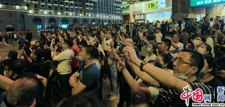 2020年8月23日,黑龙江省哈尔滨市,哈尔滨啤酒120周年庆典,在哈尔滨地标建筑防洪胜利纪念塔上空,800架无人机编队造型,打出“早日和口罩说再见”、“小啤酒小烧烤越吃越有味儿”、“为更好的哈尔滨干杯”等字样,点亮夜空,吸引万人围观。张澍/IC photo