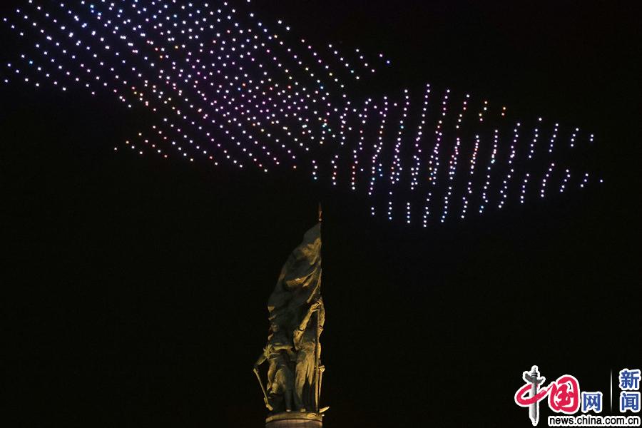 2020年8月23日,黑龙江省哈尔滨市,哈尔滨啤酒120周年庆典,在哈尔滨地标建筑防洪胜利纪念塔上空,800架无人机编队造型,打出“早日和口罩说再见”、“小啤酒小烧烤越吃越有味儿”、“为更好的哈尔滨干杯”等字样,点亮夜空,吸引万人围观。