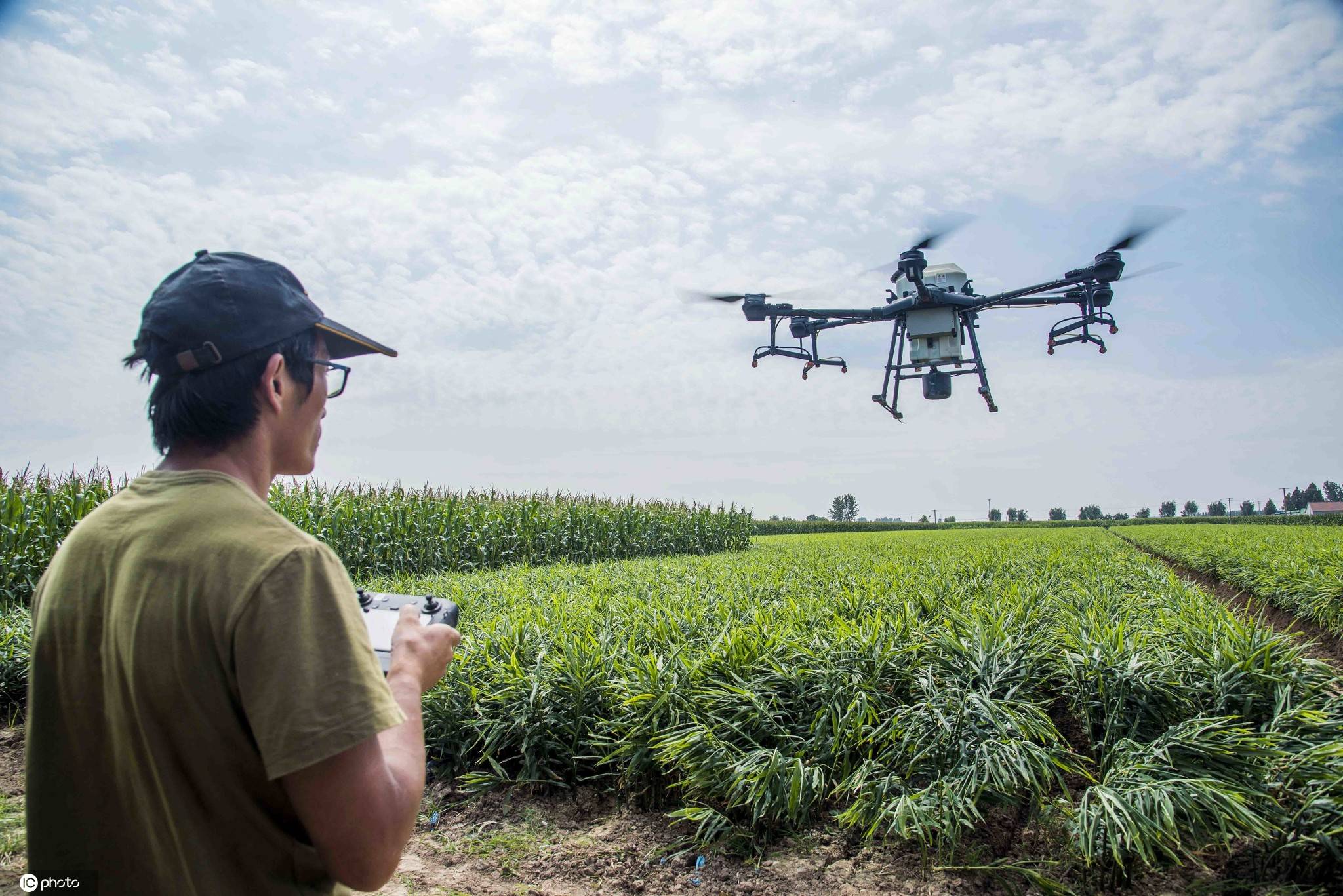 山东省青州市农机部门联合专业合作社,利用植保无人机帮助农民进行大姜喷药杀菌作业。