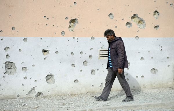 9月29日,在阿塞拜疆临近纳卡边境的塔塔尔地区,一名村民从布满弹孔的墙壁旁经过。来源:新华社