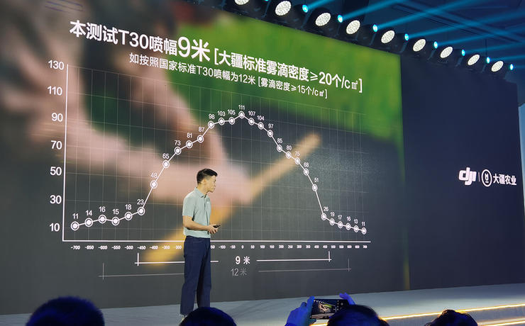 作为农业生产工具,植保无人机要提升生产效率要考虑三个因素载重、流量、喷幅。 据陈韬介绍称,此次T30最大载重提升至30公斤,药液载重比达到46%;搭载全新柱塞泵,可提供8L/min超大流量;全新16喷头布局,保证喷洒雾滴均匀性同时,有效喷幅可达9米;8组电磁阀可对各组喷头独立变频控制,实时飞行速度与喷洒量联动,全程喷洒均匀。 T30实测大田效率可达每小时240亩次,相比上一代产品(T20)提升33%。