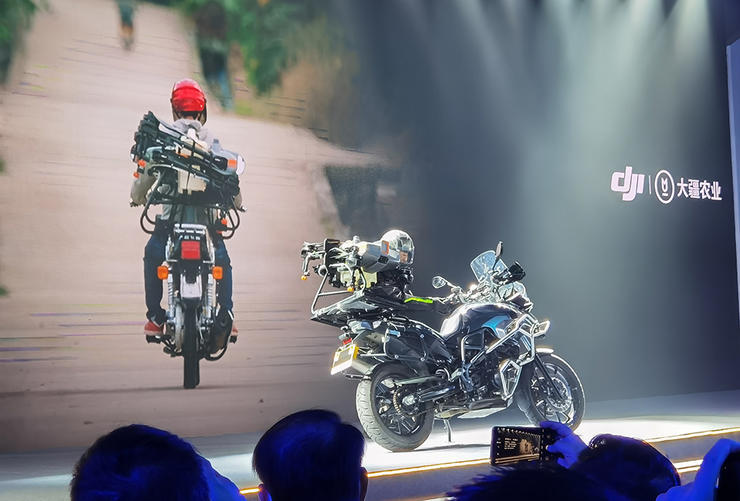 至于体型有多小,在发布会现场,T10是被大疆工作人员放在摩托车后座上、骑着摩托车载上来的。