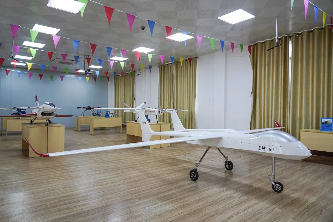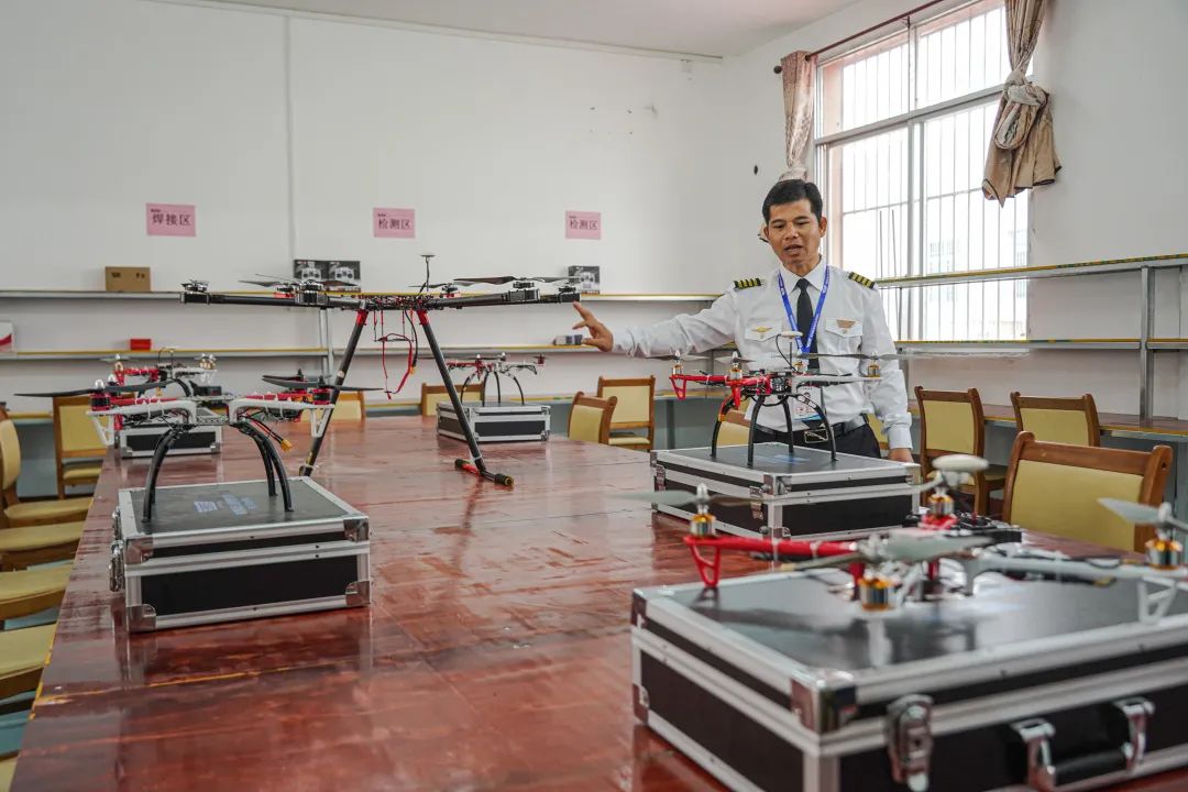 ▲忻城职高的无人机展厅。 离开展厅来到教室,几十架无人机整齐的停放在工作台上,与楼下展厅的无人机有所不同,这里的无人机通体由复杂的线路和零件拼接而成,就在记者以为这只是模型时,南京新航线无人机飞行学院广西培训基地(忻城职业技术学校)院长文年专看出了我们的疑虑,笑呵呵转过身来,“这些都是由学生自己手动组装的无人机,真的可以飞上天,等下我带你们去看看学生们的飞行实训课”。