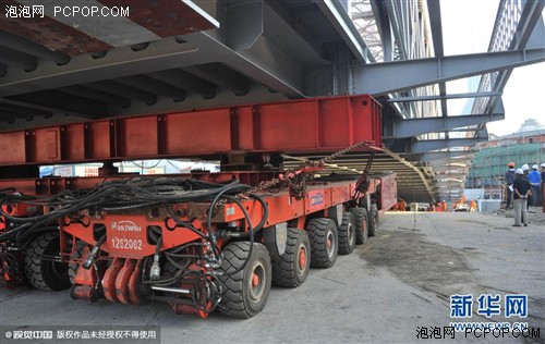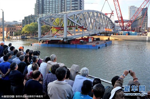 2015年10月18日,上海,经历了4个多月紧张施工,整修一新的107岁的浙江路桥“回家”。 本次维修最大亮点之一是“修旧如旧”,大桥以“交通灰”新颜重现1908年的桥头门形设计,其间有网状纹饰。据悉浙江路桥钢结构桥身复位后,还要在钢桥面上铺装沥青面层、木质人行道板,另外还有各类附属管线、装饰灯具的安装工作,预计年内通车,将继续使用50年。
